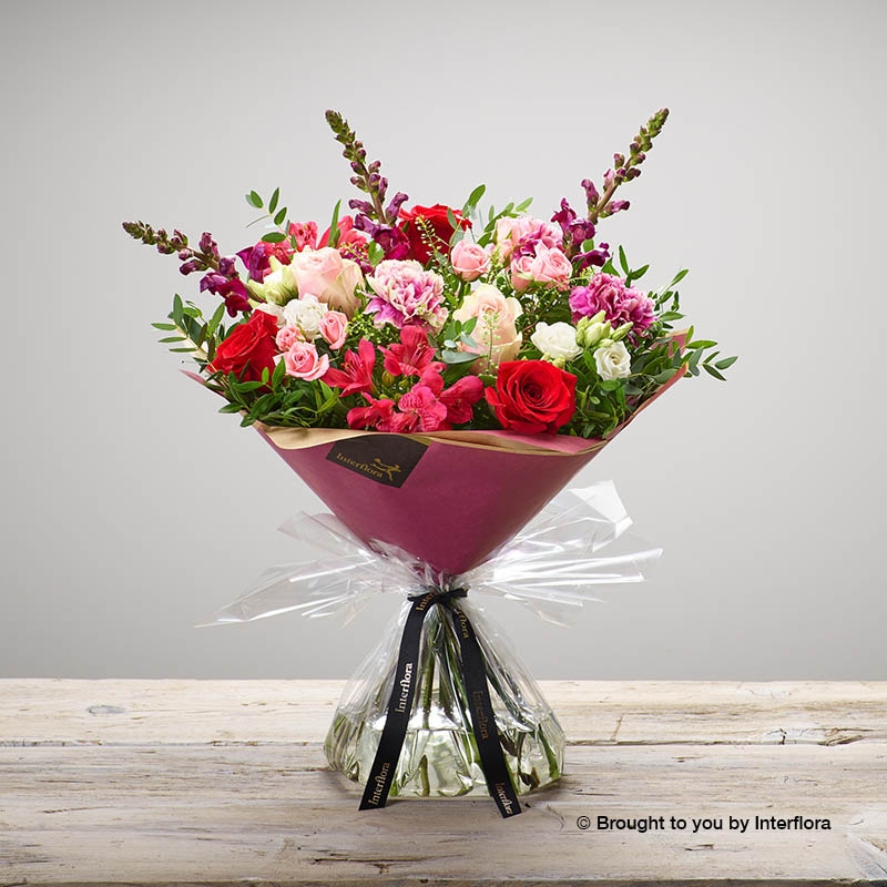 Send a grand gesture of love this Valentine’s Day with our Raspberry Romance Hand-tied. Raspberry Romance Hand-tied includes some of the most romantic blooms in the world. Our flower team source the finest Freedom red roses, delicate pink roses, alstroemeria, antirrhinum, carnations, and add green foliage for extra texture.