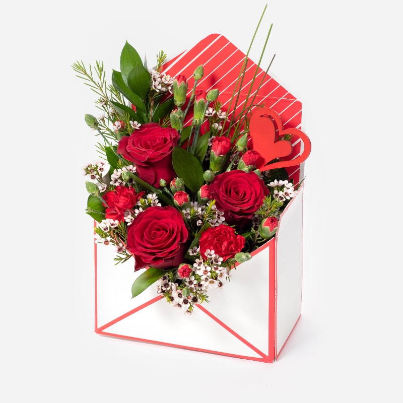 A Trio of Red Roses displayed in a Envelope container ready to give to your loved one