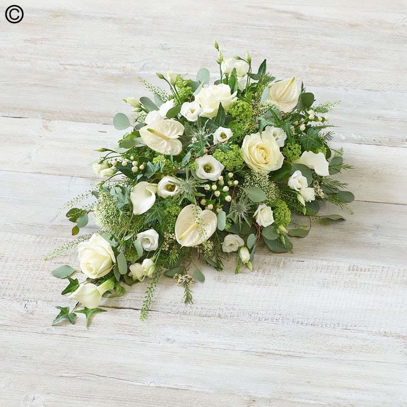 A lush blend of white and green featuring calla lilies, anthurium, and viburnum opulus.Ivy weaves elegantly through the teardrop shape.